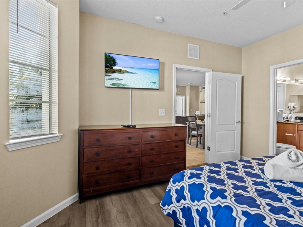 The master suite features a cozy king-size bed, an ensuite bath, and a TV for private relaxation. The second bedroom offers two twin beds, perfect for kids or travel companions, with its own ensuite bath.