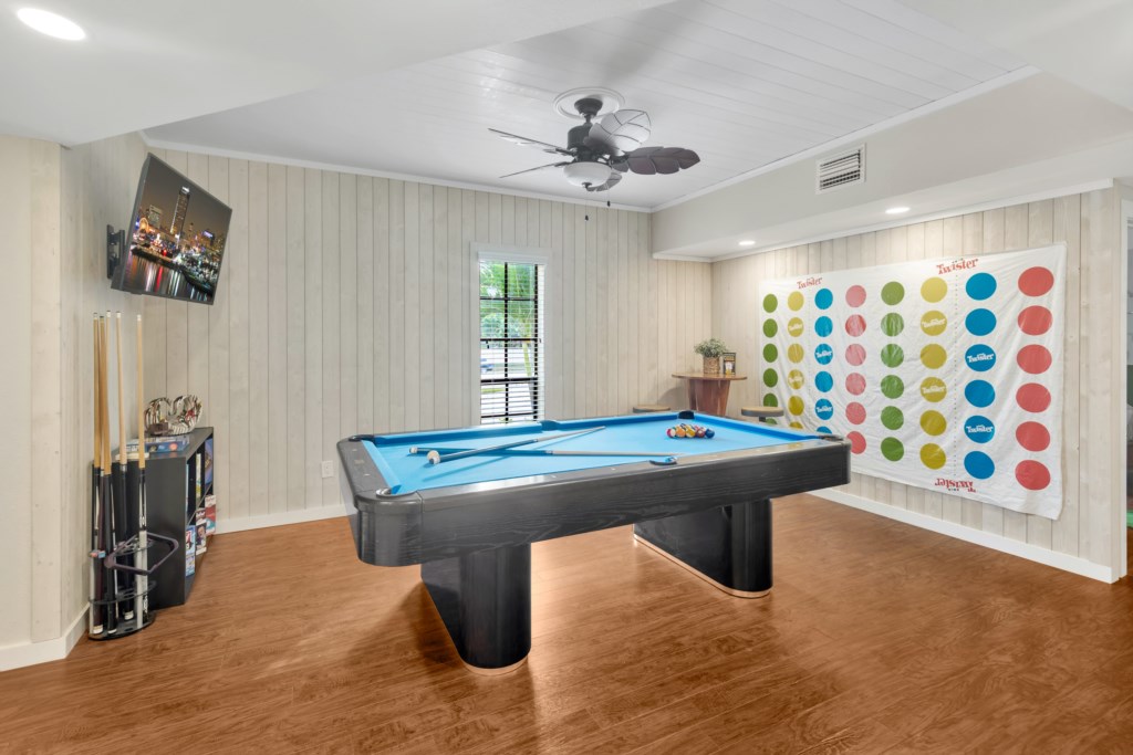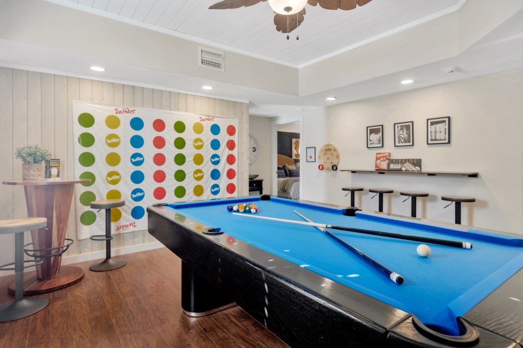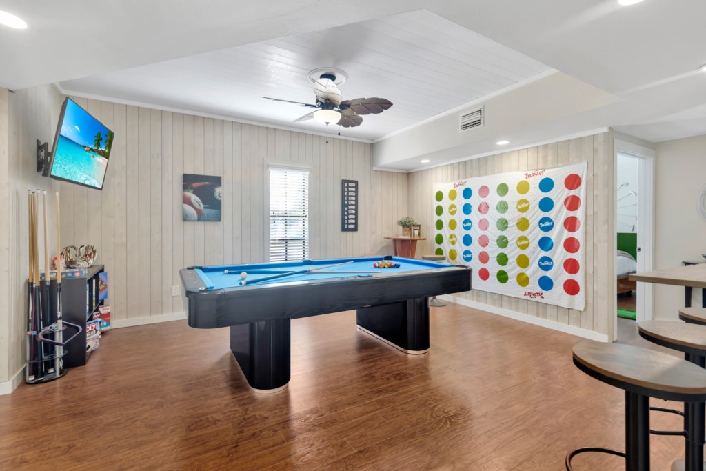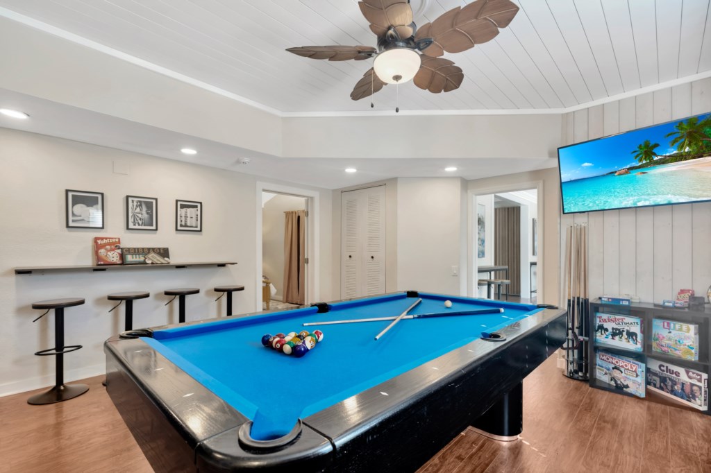 This spacious multi-level villa includes 8 bedrooms, 7 bathrooms, formal dining room with seating for 12, spacious family room with a fireplace, a games room with a Foosball table, 3 Smart HDTVs, and a billiards table, a large Chef's Kitchen, with stainless-steel appliances and fully stocked with everything you may need. Plenty of outdoor space with a private fully fenced heated pool, a firepit area, and an outdoor dining area with a BBQ grill (charcoal & tongs provided). Balcony on the second floor, covered porch on the first floor. Stand alone laundry building. High-Speed WiFi throughout, TVs in every room with top streaming services, Beach & Outdoor essentials provided (8 foldable beach chairs, pool floats & towels, umbrella & cooler), and we've got the little ones covered too (baby monitor, high chair, children’s toys & books, travel cot (52” x 28”), baby gates and kids’ tableware).