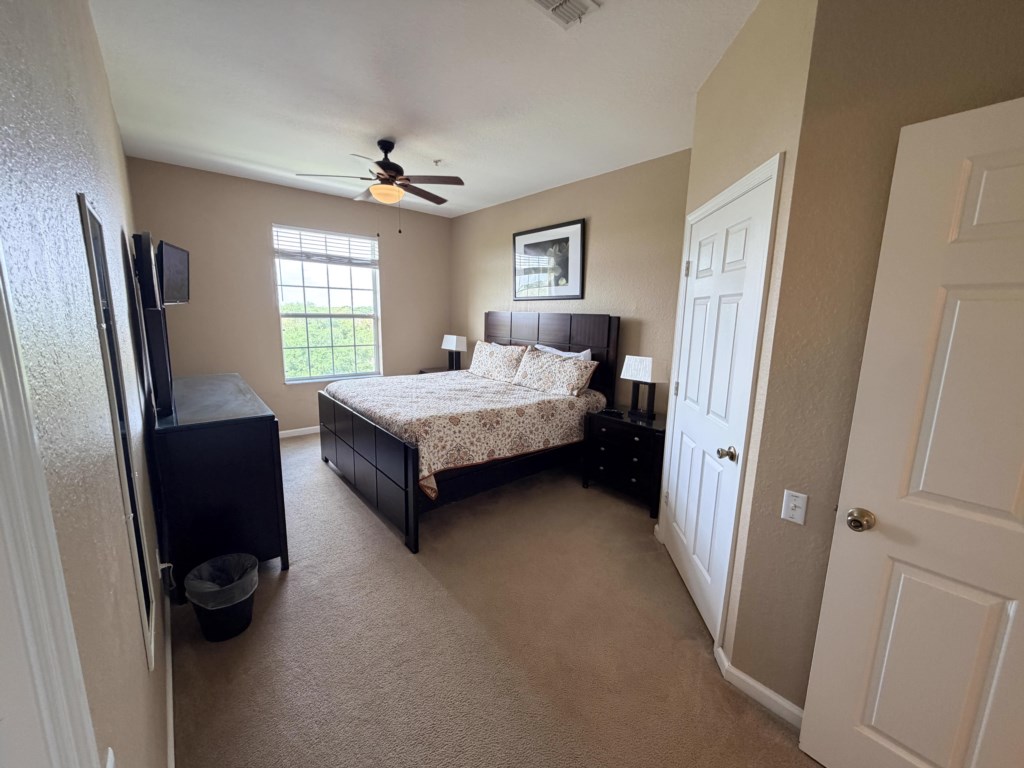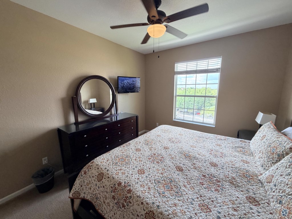 • 1 King Bed with Flat Screen TV, Ceiling Fan, Ensuite Bathroom (MA. BATH) with Sink Vanity, Shower, and Walk-In Closet.