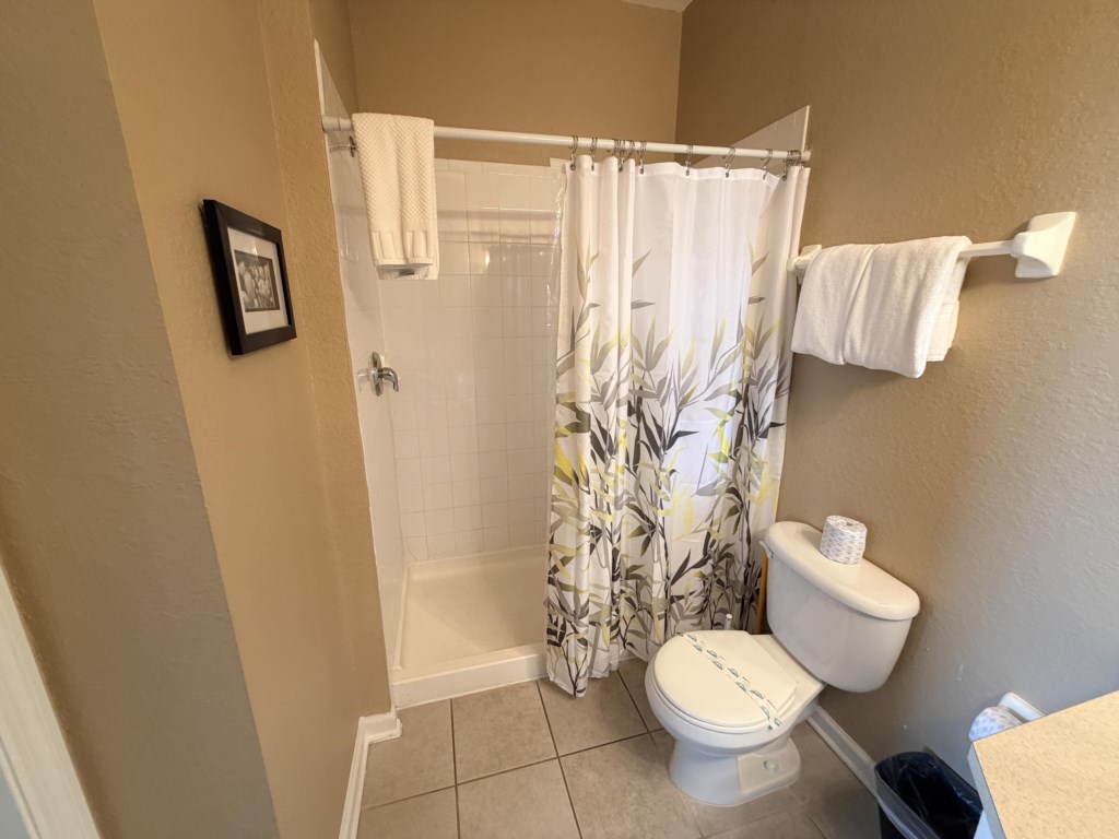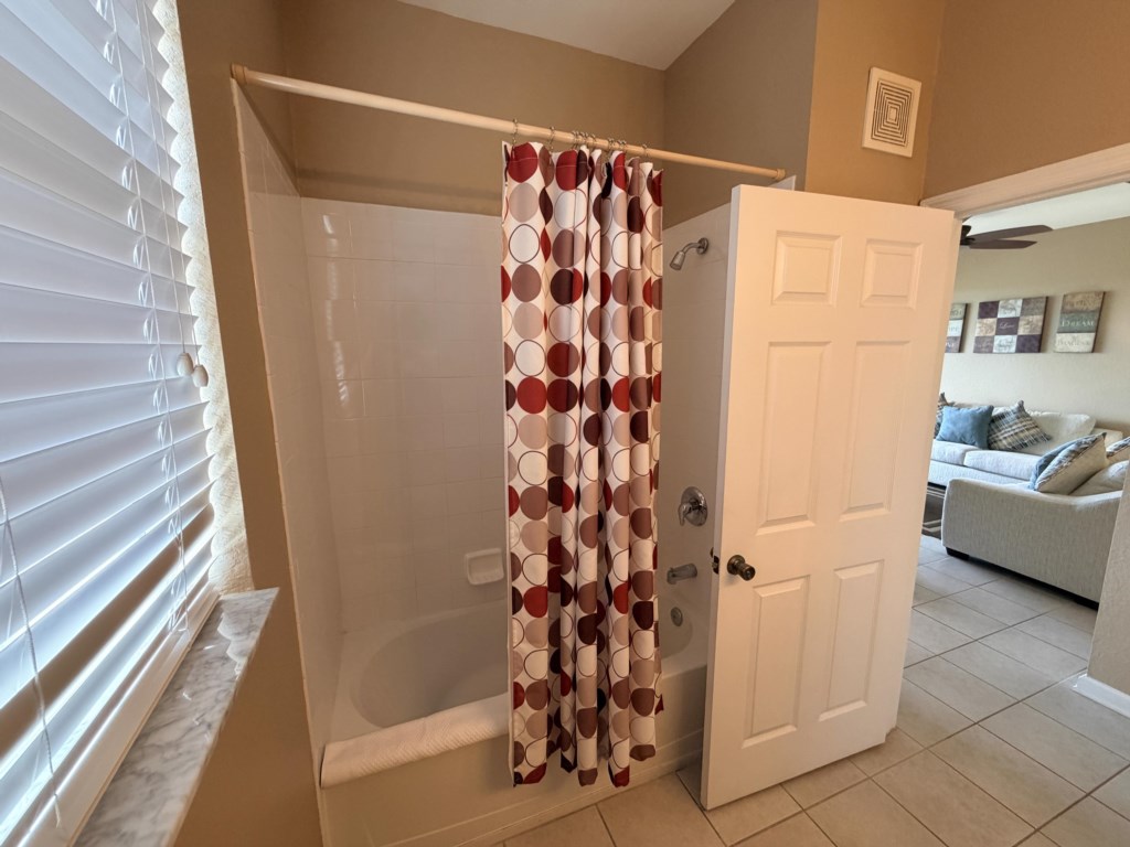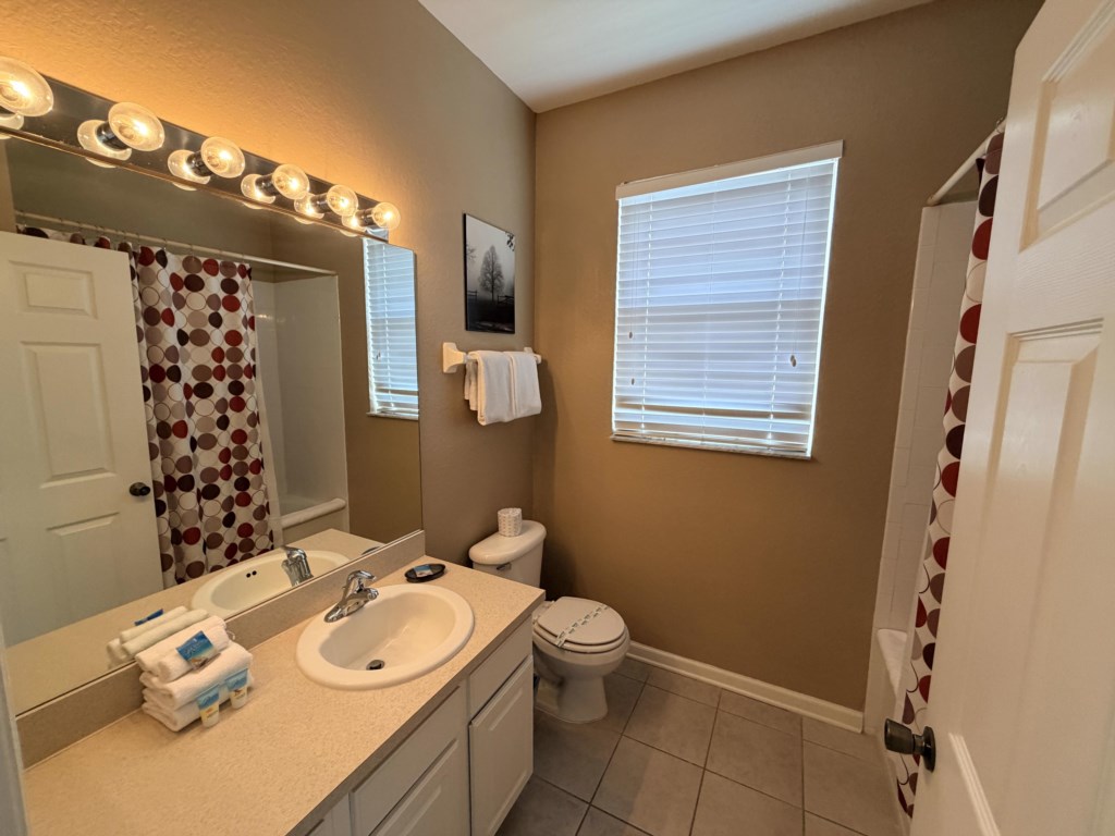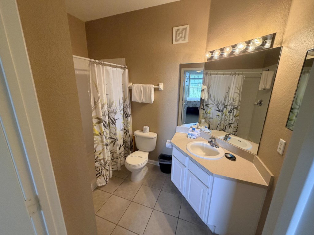 • 2 Twin Beds, Ceiling Fan, Hallway Bathroom (BATH 1) with Single Sink Vanity and Shower & Tub Combination. This bathroom is shared with Bedroom 3.