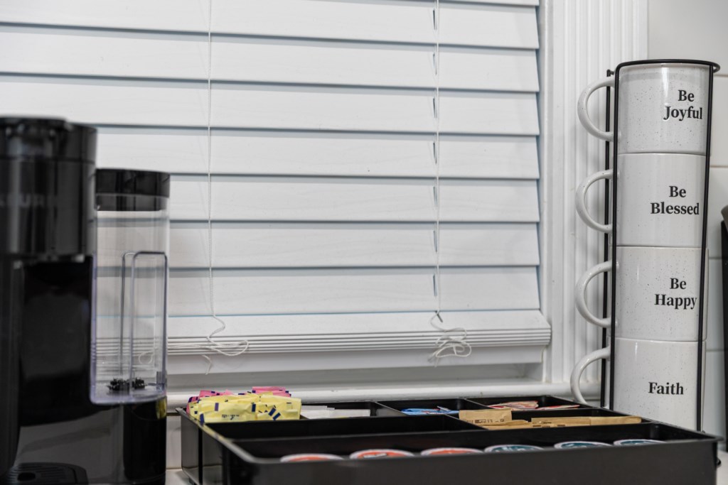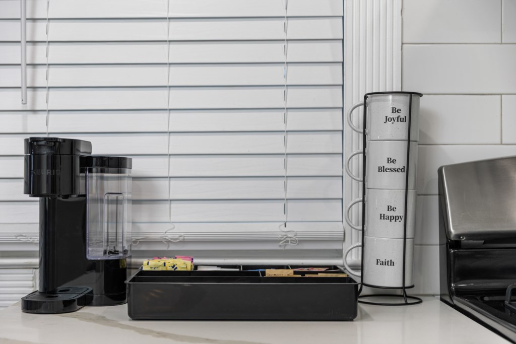 - Keurig + K-Cup station with sugar, Splenda, and stirrers