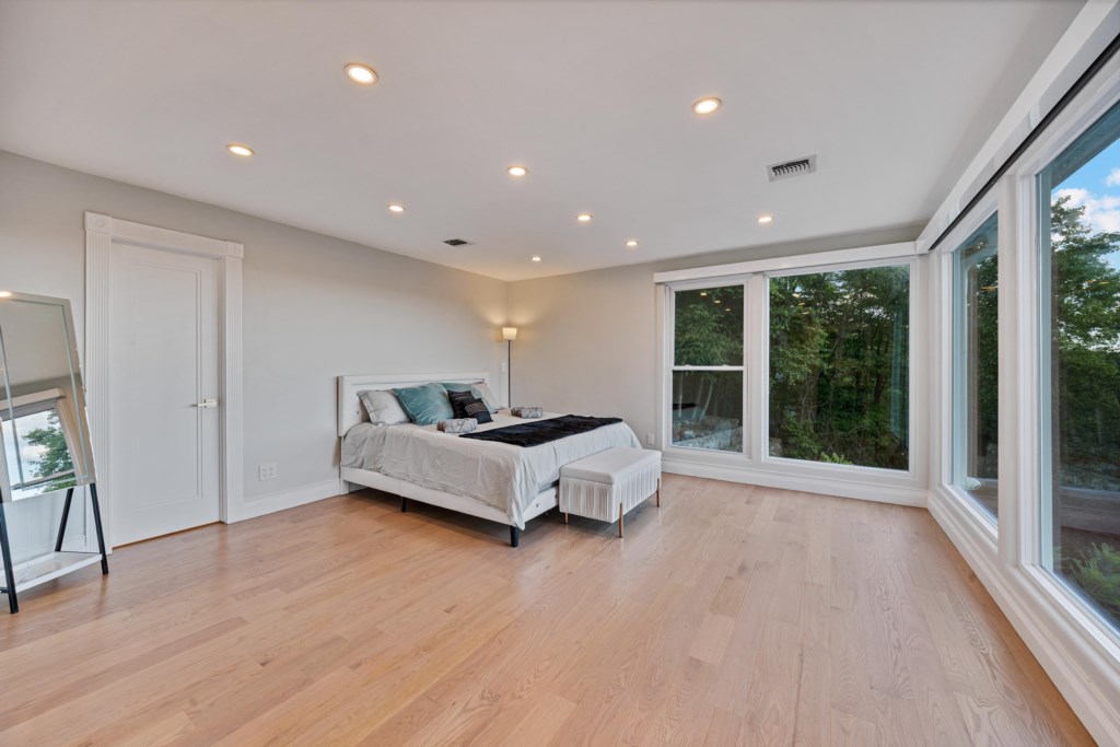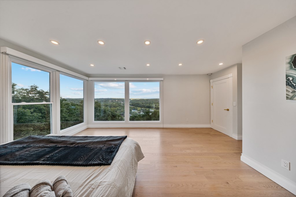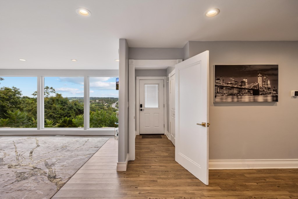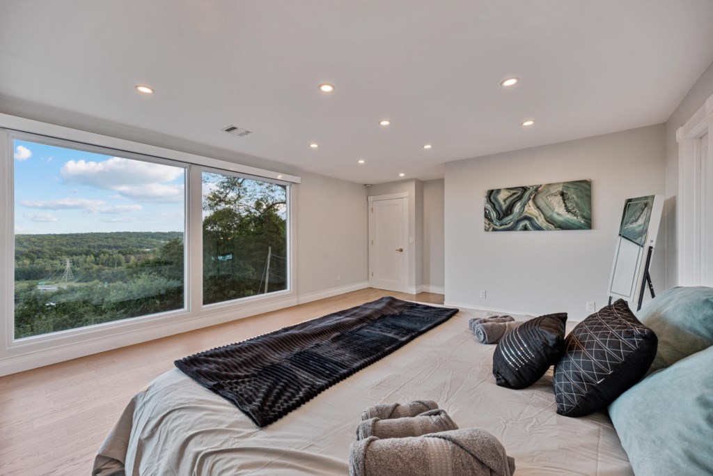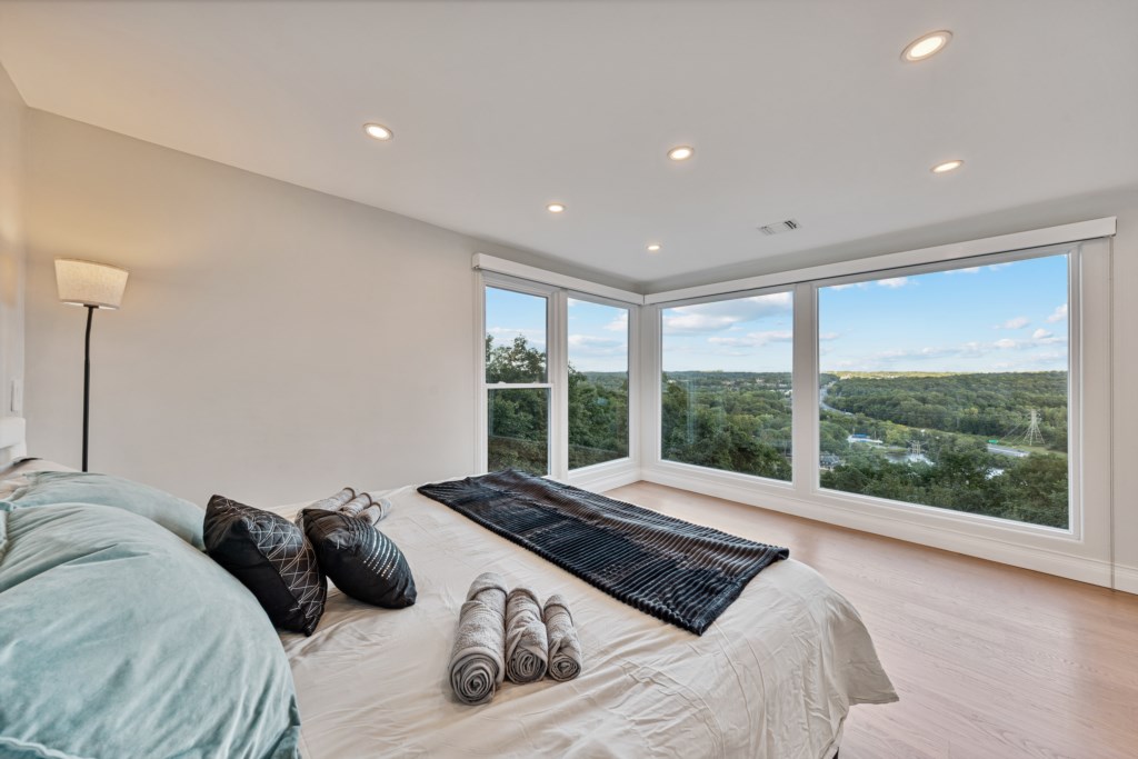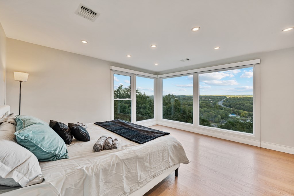 Master Bedroom (Top Floor) – 1 King Bed with Massive windows offer panoramic views of the mountains and NY Thruway. Flooded with light, this is a true retreat with comfortable bedding and serene vibes.