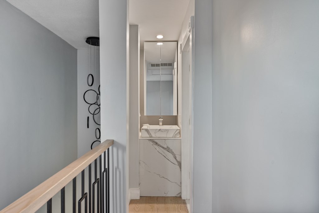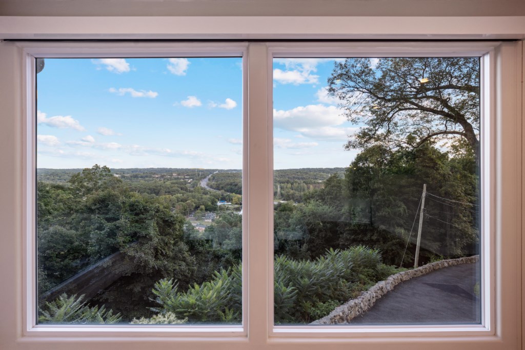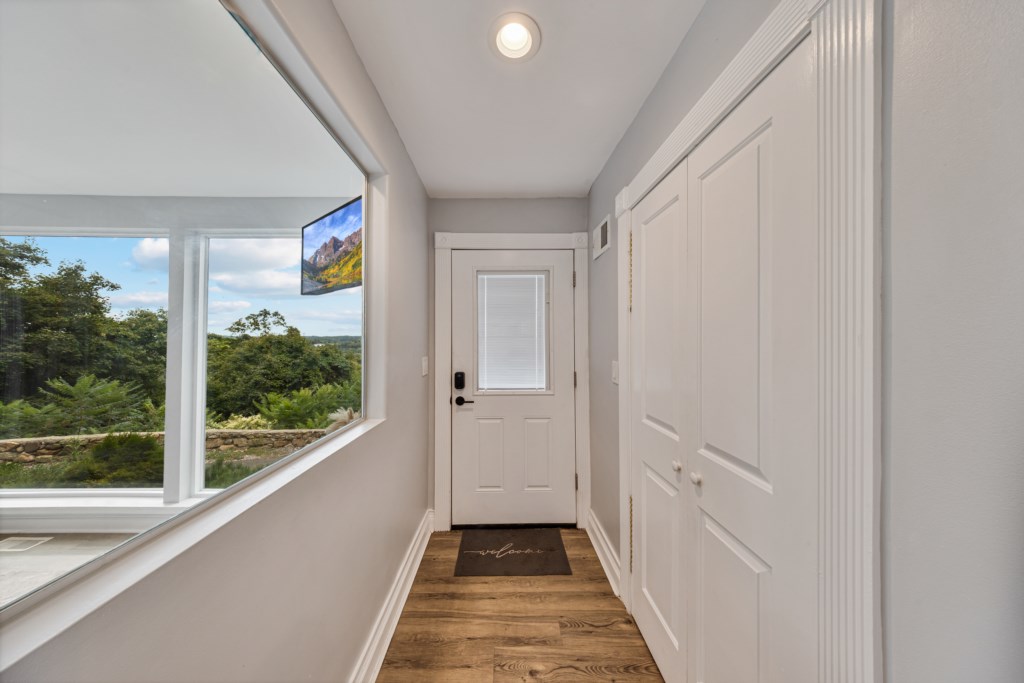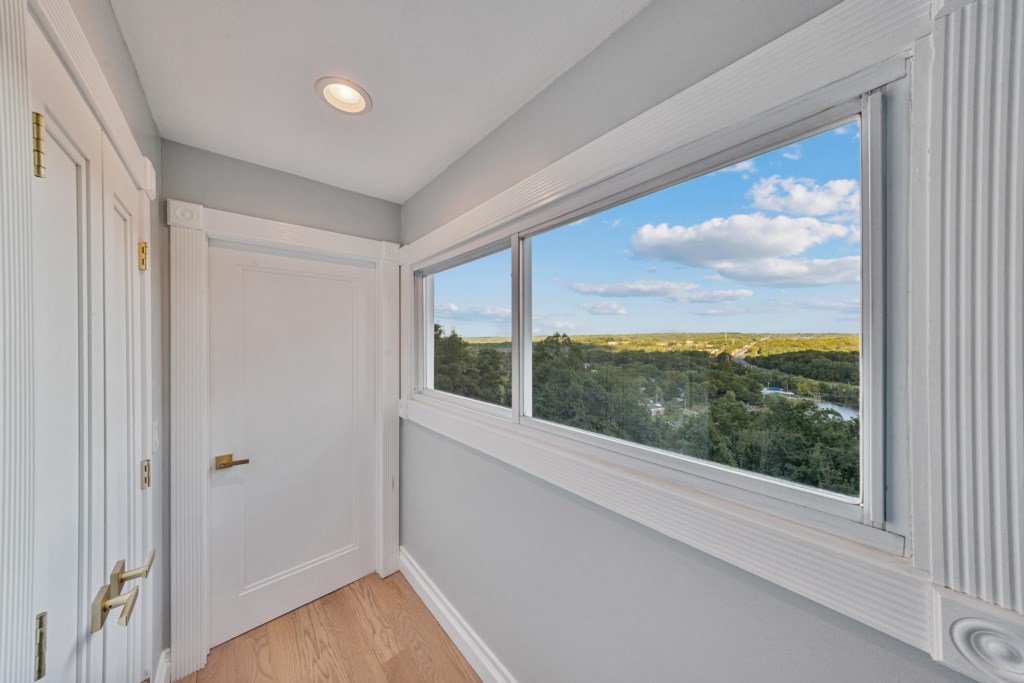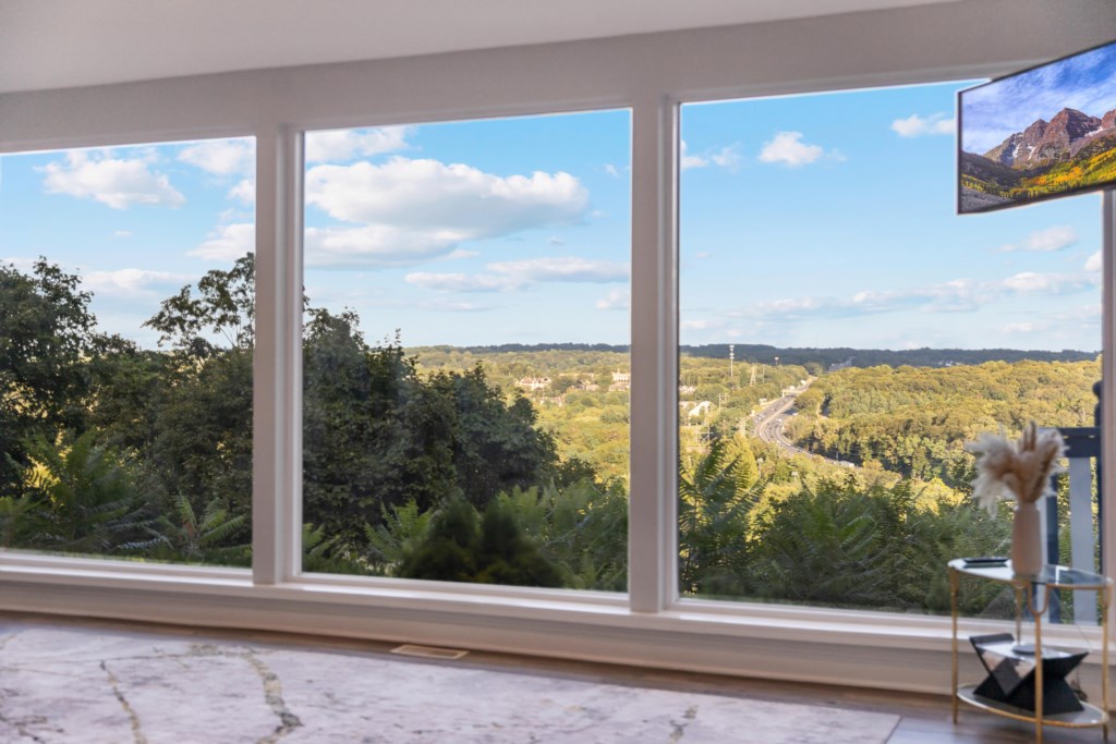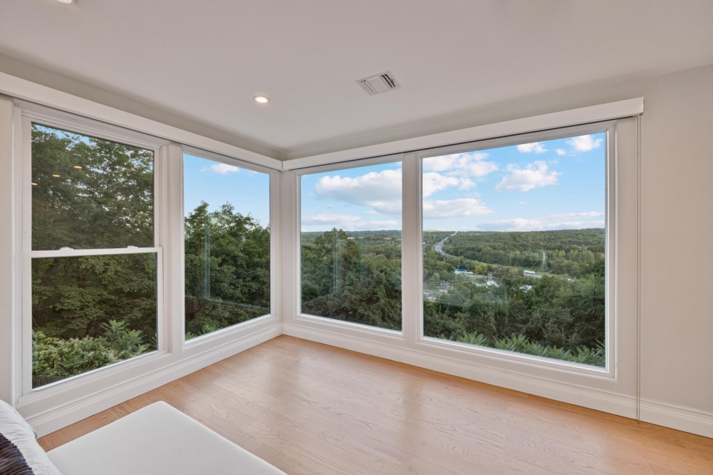 Master Bedroom (Top Floor) – 1 King Bed with Massive windows offer panoramic views of the mountains and NY Thruway. Flooded with light, this is a true retreat with comfortable bedding and serene vibes.