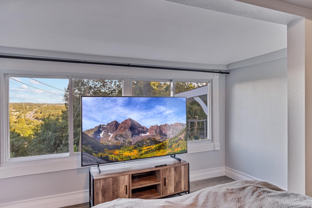 Living Room – Wrapped in floor-to-ceiling windows showcasing stunning mountain views, this central gathering space features cozy seating, board games, and a Smart TV for streaming your favorite content.
