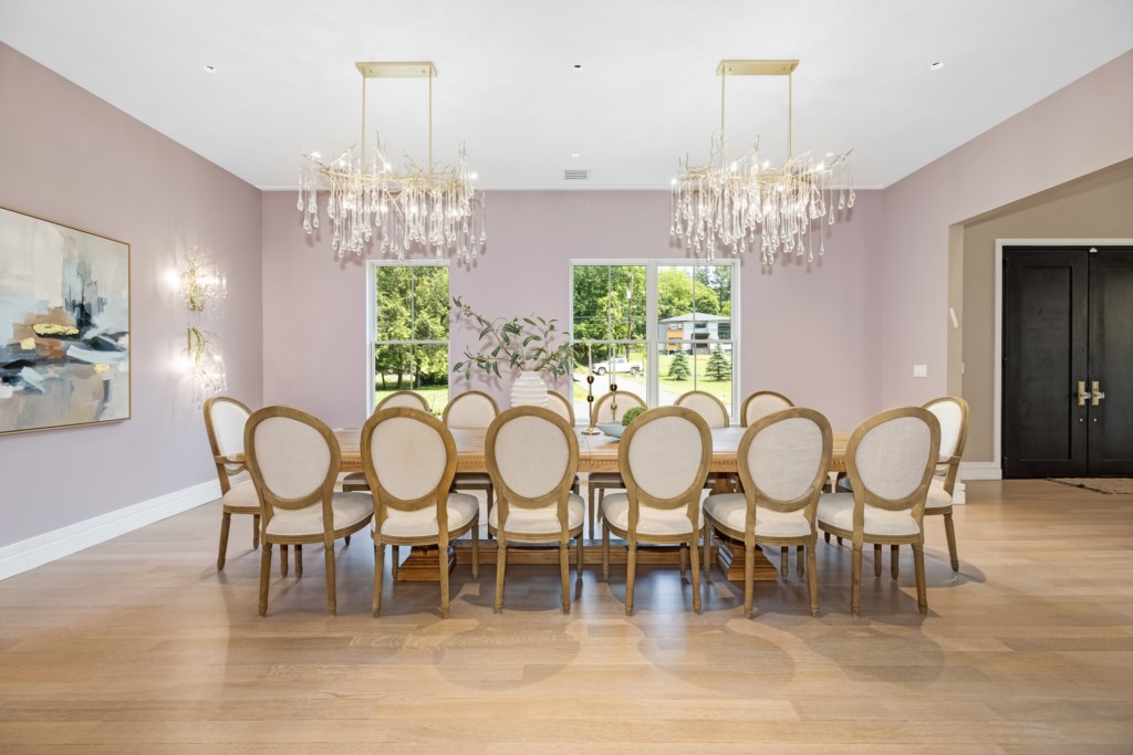 The dining room seats 14 guests, ideal for family gatherings or executive dinners.