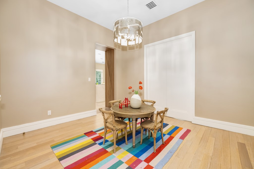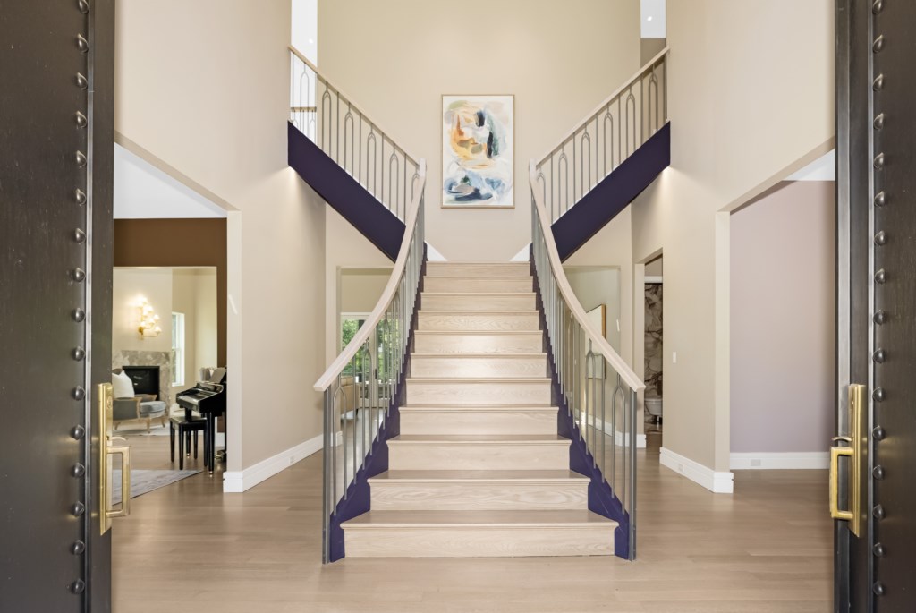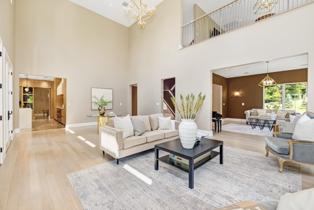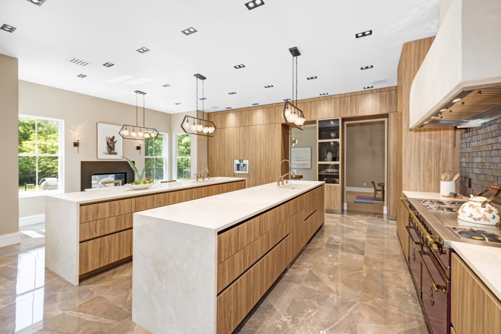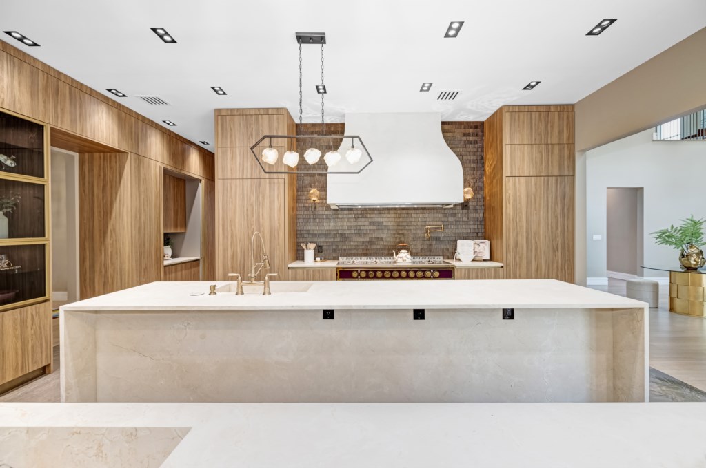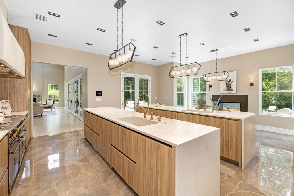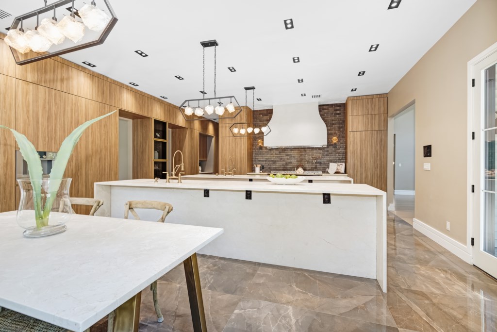 The open living area flows seamlessly into the formal dining room and chef’s kitchen.