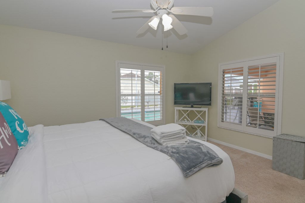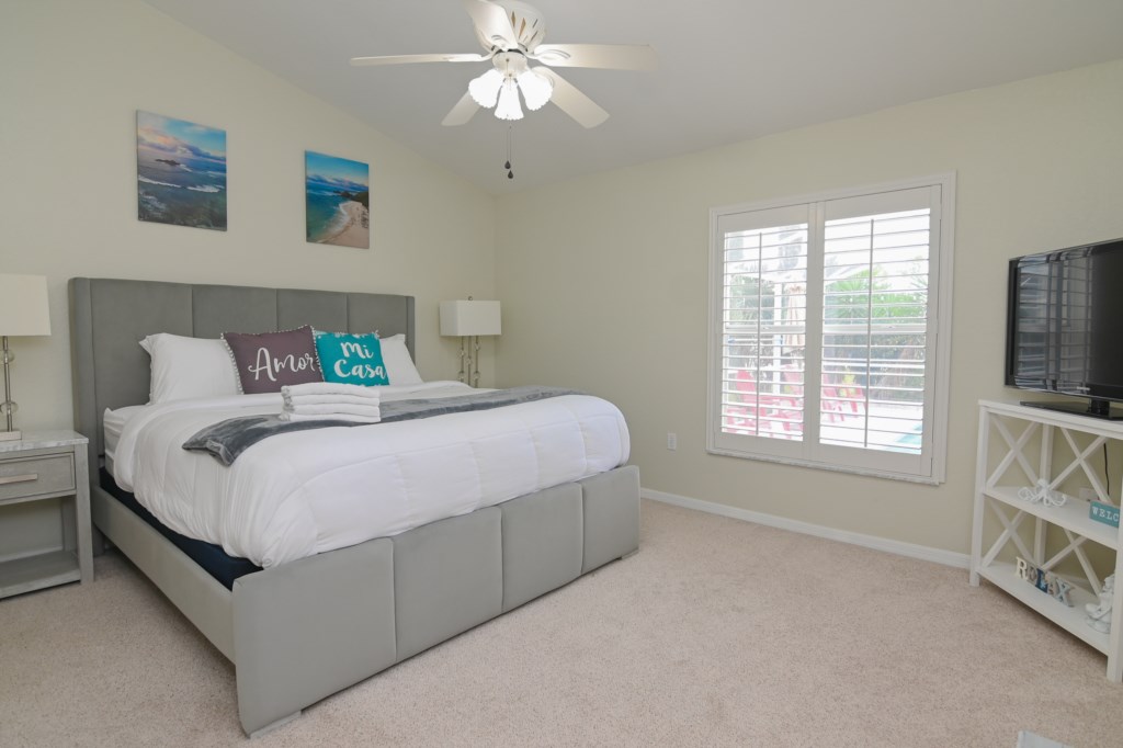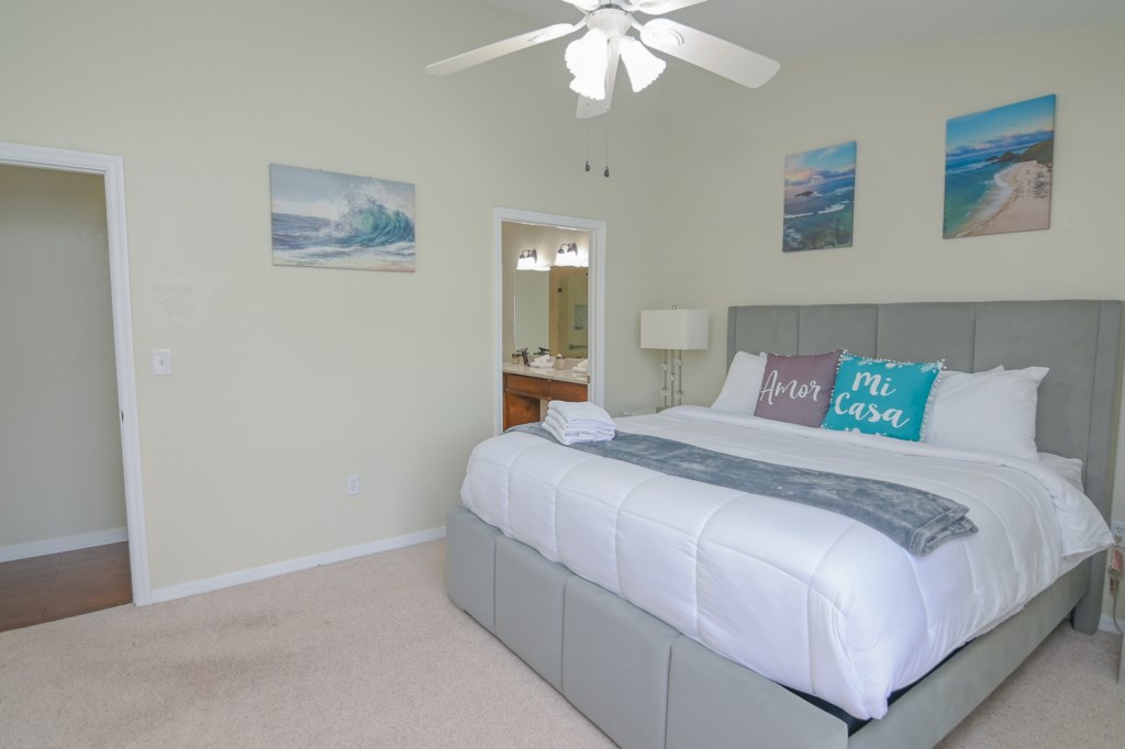 - 1 King Bed with Flat Screen TV, Ceiling Fan, Ensuite Bathroom (MA. BATH) with Double Sink Vanity, Garden Tub, Shower and Walk-In Closet.