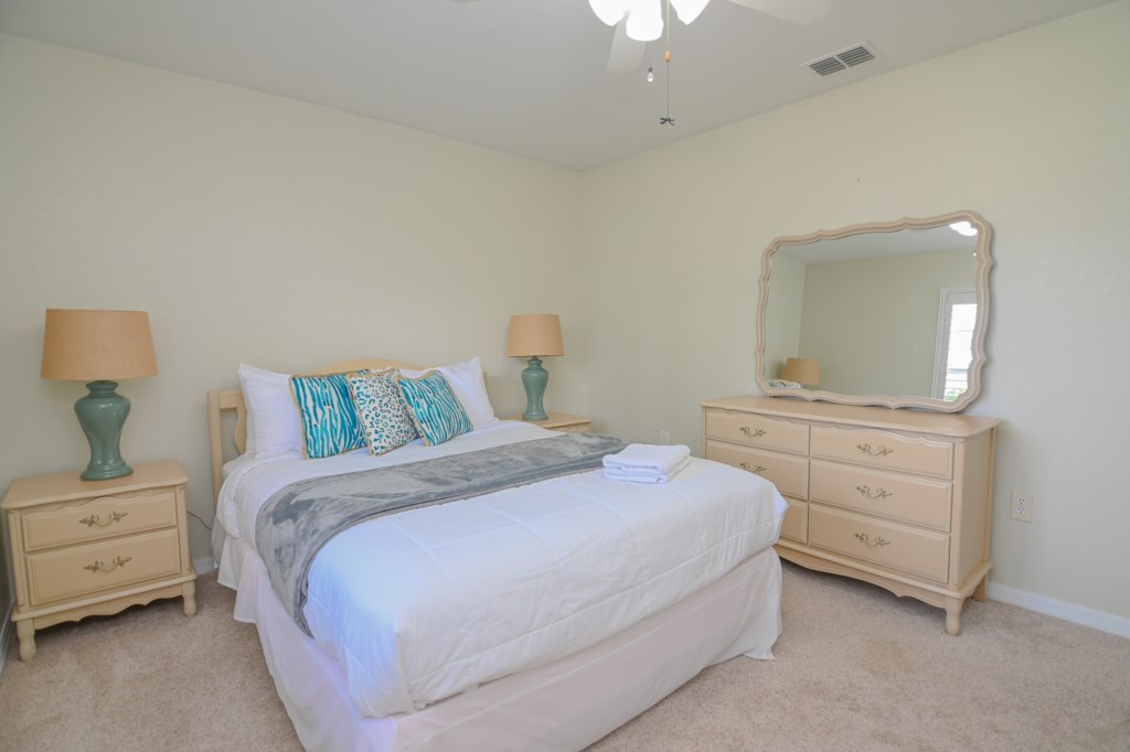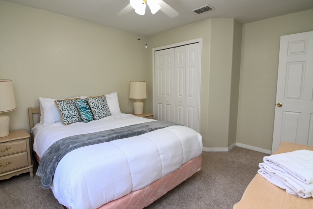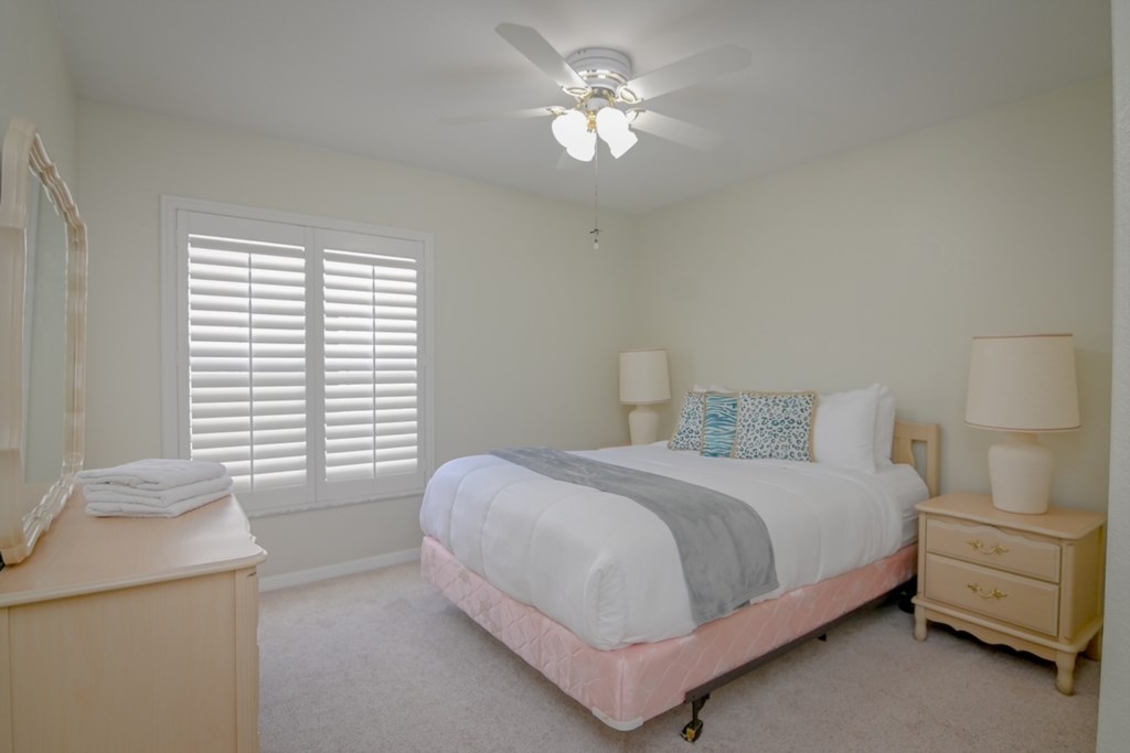- 1 Full Bed with Ceiling Fan, Hallway Bathroom (BATH 1) with Single Sink Vanity and Shower & Tub Combination. This bathroom is shared with Bedroom 2.