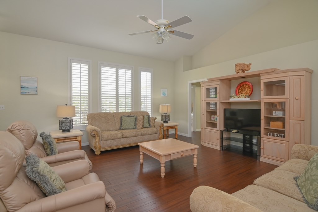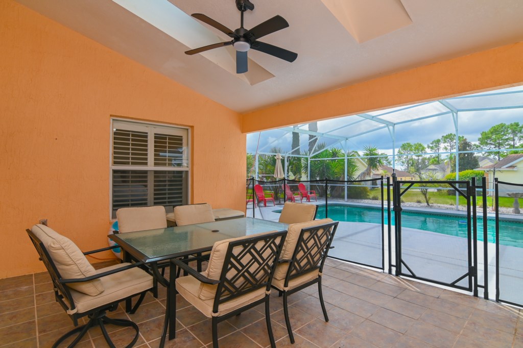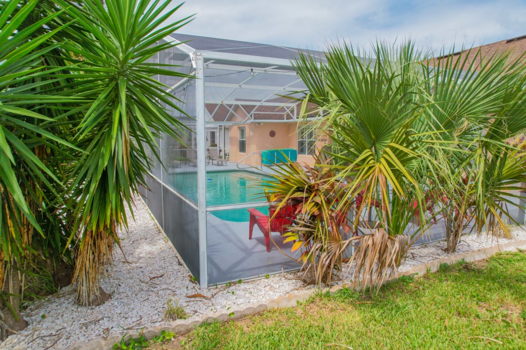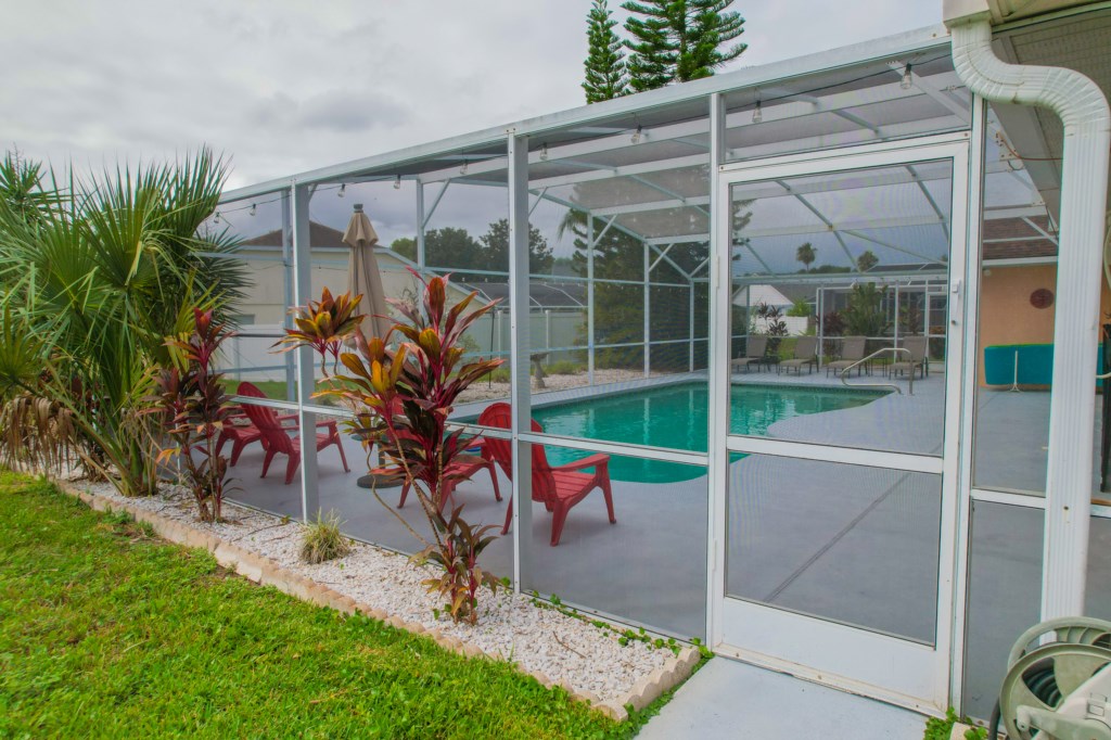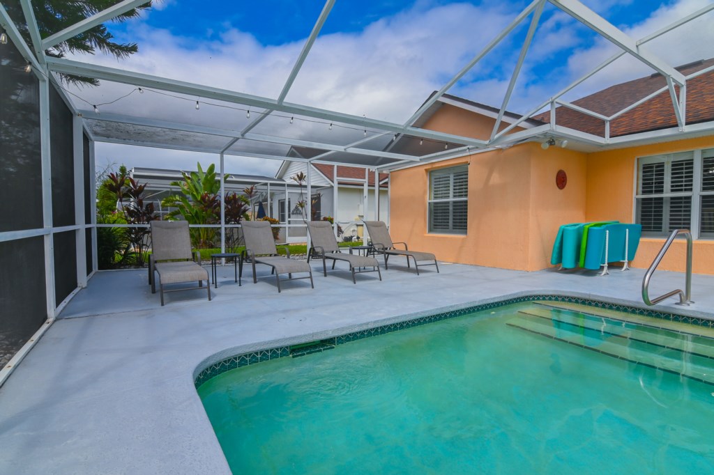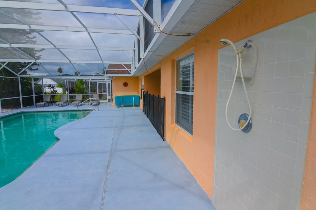 - Private Screened South Facing Swimming Pool with Outdoor Furniture including Seating for 6 and Ceiling Fan in Lanai Area, as well as a Large Patio Area with Outdoor Shower, 4 Chaise Lounges, 4 Adirondack Chairs along with Patio Umbrella and 4 Foam Pool Loungers